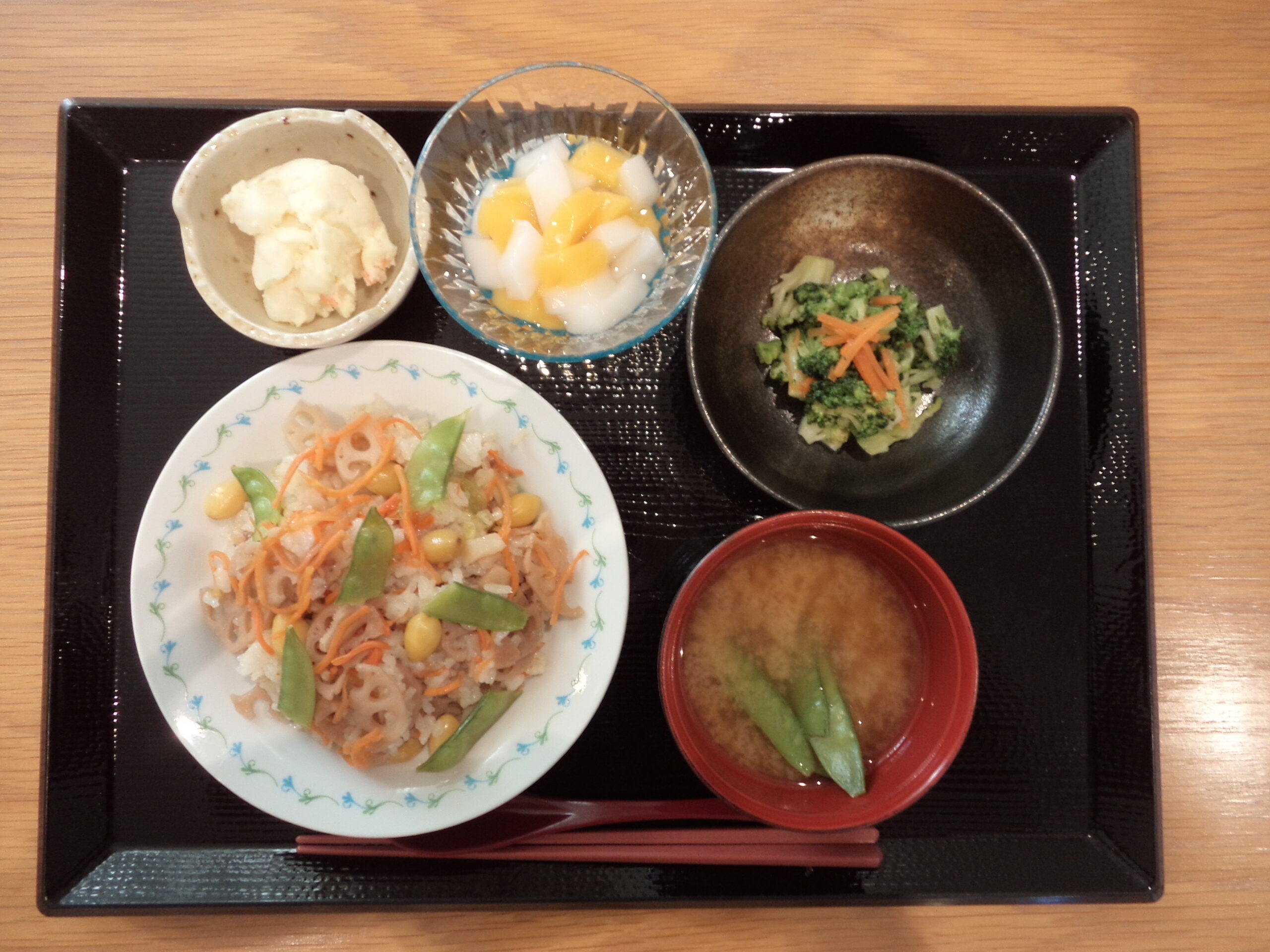 • 照り焼きチキンにフキとピーマンの付け合わせ